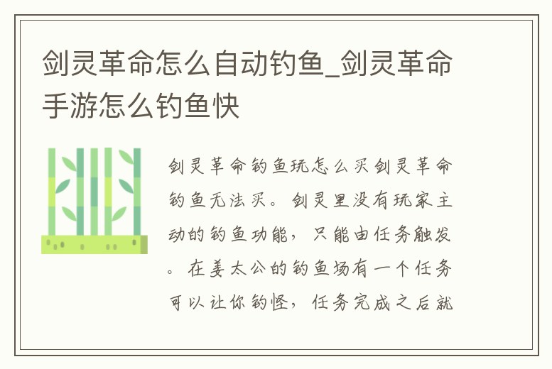 劍靈革命釣魚無法買。劍靈里沒有玩家主動的釣魚功能,只能由任務觸發。在姜太公的釣魚場有一個任務可以讓你釣怪,任務完成之后就不能使用魚竿了。另外在半月湖也有個可以釣怪物出來。