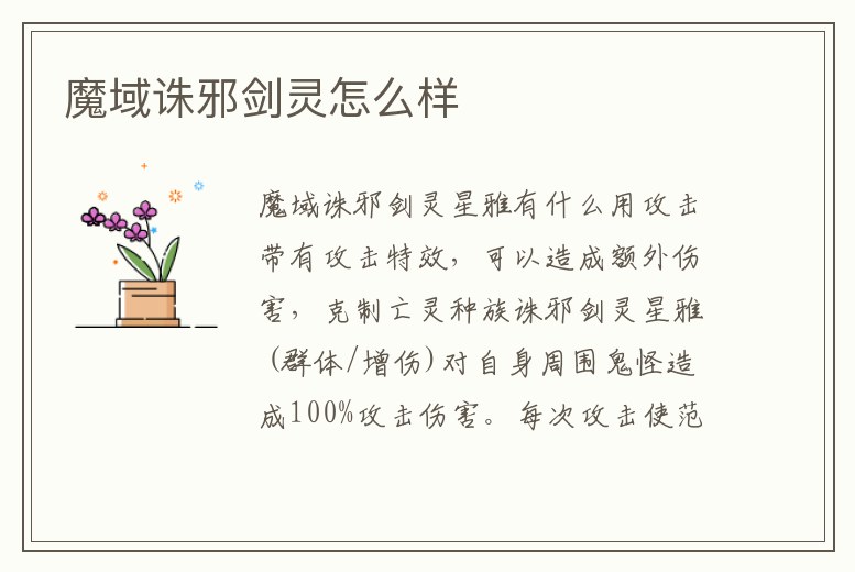 攻擊帶有攻擊特效,可以造成額外傷害,克制亡靈種族誅邪劍靈星雅 (群體/增傷)對(duì)自身周圍鬼怪造成100%攻擊傷害。每次攻擊使范圍內(nèi)鬼怪虛弱,使其受到傷害增加10%/15%/30%,持續(xù)3/3/6秒。