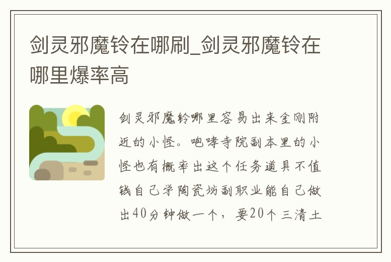 問題八:劍靈 邪魔鈴在哪里刷 邪魔鈴是在大漠學習二段清空需要的任務道具,大漠所有的怪物,包括副本都可以爆出來,拍賣上一般4Y~10Y不等,各大區價格有所浮動,不用刻意去刷,慢慢來,沒準下一秒就爆出來了,沒爆出來也。