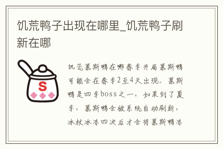 春季開局慕斯鴨可能會在春季2至4天出現。慕斯鴨是四季boss之一,如果到了夏季,慕斯鴨會被系統自動刷新,冰杖冰凍四次后才會將慕斯鴨凍結,使用麻痹吹箭可以一箭催眠慕斯鴨。當玩家于慕斯鴨戰斗時,玩家攻擊三次之后慕斯鴨就會。