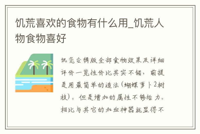 饑荒合輯版全部食物效果及詳細評價一覽性價比其實不錯,前提是用最簡單的造法(蝴蝶蘿卜2樹枝)。但是增加的屬性不夠給力。相比與其它的加血神器就顯得不那么出色了。建議:花很多的時候可以較為輕松地獲得大量蝴蝶,純素食流的也可以用它回血(因為火龍果加饑餓過。1、饑荒咸的食物有什么用饑荒