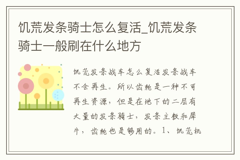 饑荒發條戰車怎么復活發條戰車不會再生。所以齒輪是一種不可再生資源,但是在地下的二層有大量的發條騎士,發條主教和犀牛,齒輪也是夠用的。1、饑荒機器人怎么升級機器人的升級教程饑荒機器人需要吃齒輪進行升級,具體步驟如下:首先在地上或者洞穴找到齒輪怪。打死齒輪怪后會掉落齒輪,鼠標點擊撿起來。撿起來后會在下方的工具欄