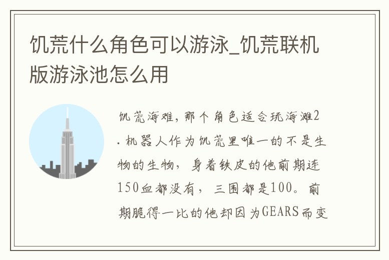 饑荒海難,那個角色適合玩海灘2.機器人作為饑荒里唯一的不是生物的生物,身著鐵皮的他前期連150血都沒有,三圍都是100。前期脆得一比的他卻因為GEARS而變得異常強大,最大可以到驚人的400!然而rog里除洞2齒輪數量有限,這使得他前期難以生存。