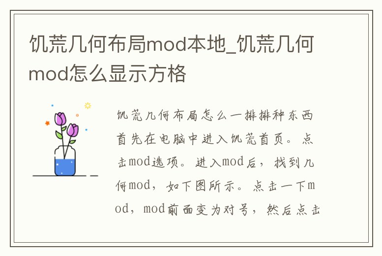 饑荒幾何布局怎么一排排種東西首先在電腦中進入饑荒首頁。點擊mod選項。進入mod后,找到幾何mod,如下圖所示。點擊一下mod,mod前面變為對號,然后點擊下方的應用。顯示mod已經安裝,點擊我知道了。使用幾何mod設置完成之后,如下圖所示。1、饑荒服務器mod怎么變成本地如果你說的是專用服務器的