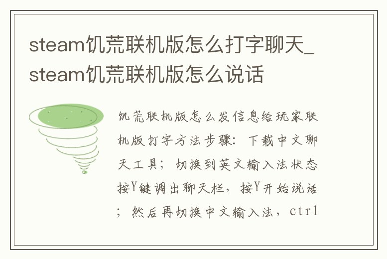 饑荒聯機版怎么發信息給玩家聯機版打字方法步驟:下載中文聊天工具;切換到英文輸入法狀態按Y鍵調出聊天欄,按Y開始說話;然后再切換中文輸入法,ctrl鍵加空格鍵,然后打字,按回車鍵Enter發送;發送文字之后,再切換成英文輸入法,否則就。2、饑荒聯