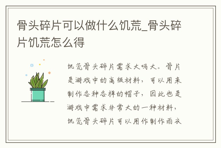 大。骨片是游戲中的高級材料,可以用來制作各種各樣的帽子,因此也是游戲中需求非常大的一種材料,饑荒骨頭碎片可以用作制作雨衣(觸手皮2個、草繩子倆捆、骨頭碎片2個在煉金術引擎處合成)防雨。