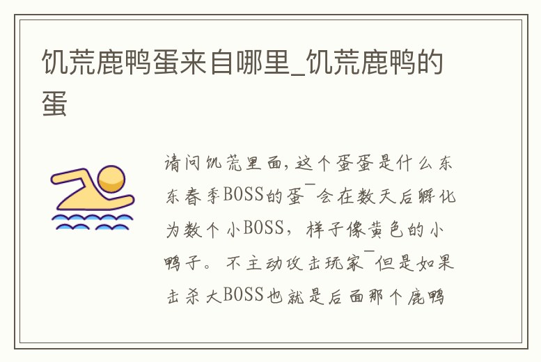 巨鴨被閃電劈后會(huì)產(chǎn)蛋。蛋用錘子砸掉,出來5只小鴨子。小鴨子在鹿鴨死后,會(huì)變得狂暴,5只狂暴的小鴨子在一起 時(shí),是饑荒最恐怖的存在。呆毛鴨是DLC版本中鹿鴨的寶寶,從鹿鴨被閃電劈中產(chǎn)蛋之后會(huì)一直孵化3~5天誕生。