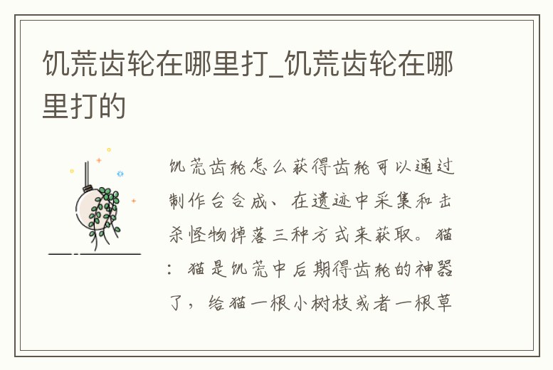 齒輪可以通過制作臺合成、在遺跡中采集和擊殺怪物掉落三種方式來獲取。貓:貓是饑荒中后期得齒輪的神器了,給貓一根小樹枝或者一根草就可以獲得各種各樣的物品。在后期地圖刷完的情況下,利用和貓交易得齒輪想必是個不錯。