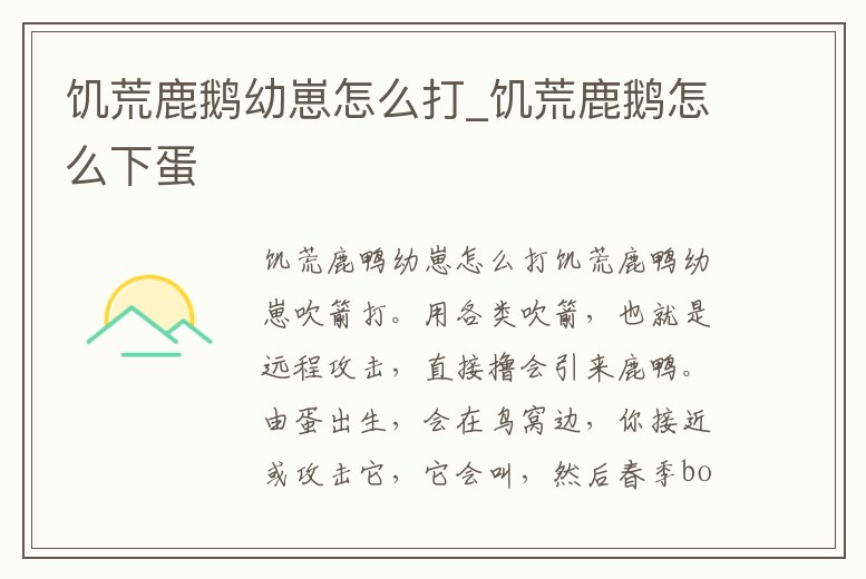 饑荒鹿鴨幼崽吹箭打。用各類吹箭,也就是遠程攻擊,直接擼會引來鹿鴨。由蛋出生,會在鳥窩邊,你接近或攻擊它,它會叫,然后春季boss從頭而降。建議萌新直接打死boss,如果你有自信的話,我建議多留幾天,等小鴨子刷出來。