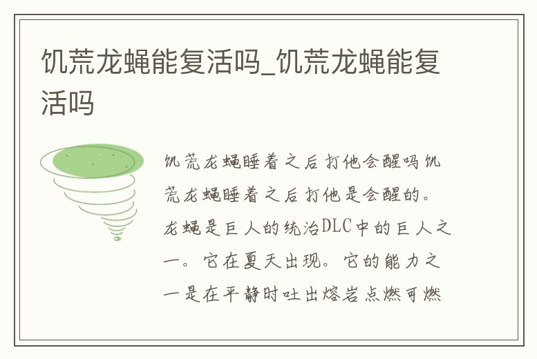 饑荒龍蠅睡著之后打他是會醒的。龍蠅是巨人的統治DLC中的巨人之一。它在夏天出現。它的能力之一是在平靜時吐出熔巖點燃可燃物來制造灰燼——龍蠅的食物。如果龍蠅吃掉了20份灰燼,它會睡著。被殺死后,龍蠅將掉落1個鱗片。