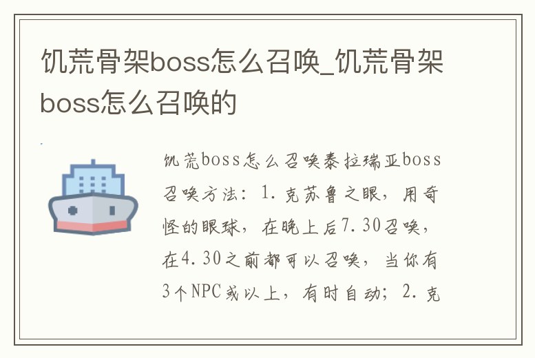 泰拉瑞亞boss召喚方法:1.克蘇魯之眼,用奇怪的眼球,在晚上后7.30召喚,在4.30之前都可以召喚,當你有3個NPC或以上,有時自動;2.克蘇魯之腦,在血腥之地,往下探索會看到發著紅光的肉瘤,挖掉它,連續挖3個即可。《。