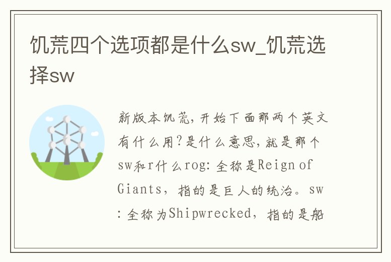 rog:全稱(chēng)是Reign of Giants,指的是巨人的統(tǒng)治。sw:全稱(chēng)為Shipwrecked,指的是船難。點(diǎn)擊sw會(huì)進(jìn)入海難版本,點(diǎn)擊rog會(huì)進(jìn)入巨人國(guó)度版本。sw是饑荒海難版本,在這個(gè)版本里整個(gè)世界地圖是一片海洋,分布著大小不同的小島。