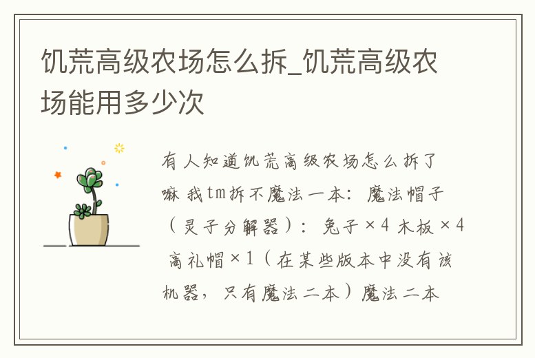 饑荒高級農場怎么拆_饑荒高級農場能用多少次