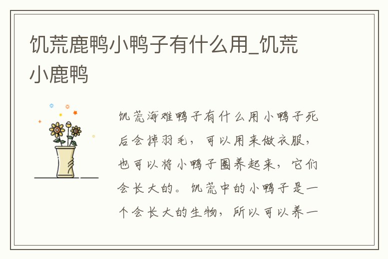 小鴨子死后會掉羽毛,可以用來做衣服,也可以將小鴨子圈養起來,它們會長大的。饑荒中的小鴨子是一個會長大的生物,所以可以養一養。經常會出現在鹿角鵝和鹿角鵝巢附近,正常情況下,它們會像火雞一樣盡量避免沖突。但是如果。