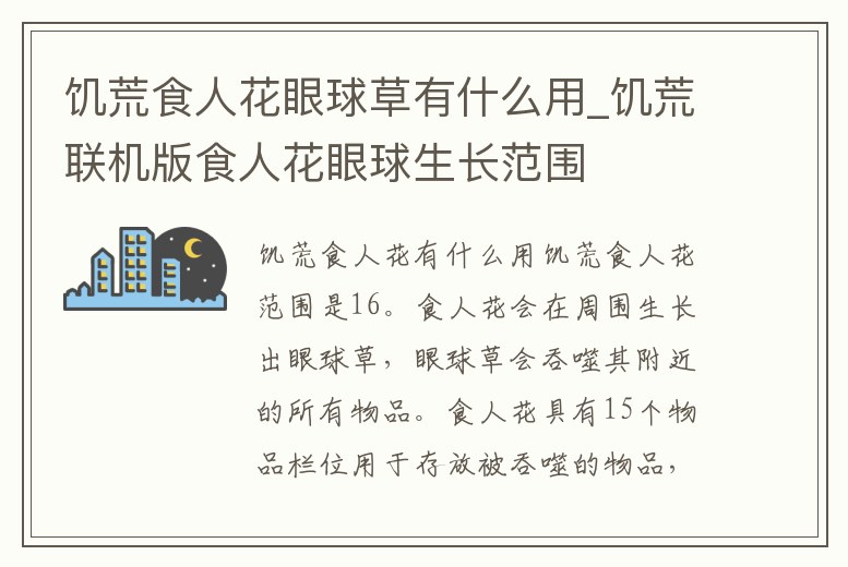 饑荒食人花范圍是16。食人花會在周圍生長出眼球草,眼球草會吞噬其附近的所有物品。食人花具有15個物品欄位用于存放被吞噬的物品,若物品欄已滿,任何新吞噬的物品都會立即銷毀。食人花每20秒才能消化1個物品,按吞噬的先后。