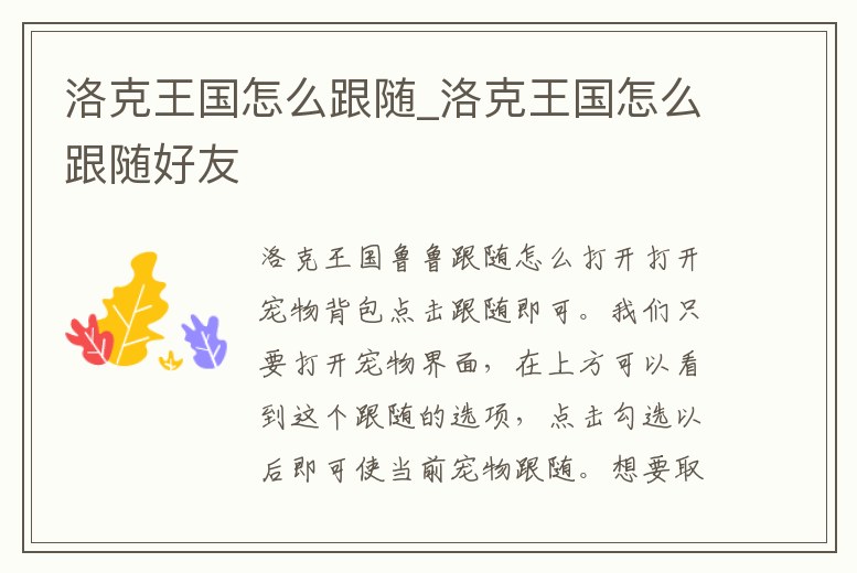 打開寵物背包點擊跟隨即可。我們只要打開寵物界面,在上方可以看到這個跟隨的選項,點擊勾選以后即可使當前寵物跟隨。想要取消的話,把跟隨選項前的對勾點掉即可。
