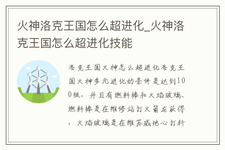 問題二:洛克王國火神怎么超進化 首先火神要100級,然后刷出變異道具--火焰玻璃和燃料棒(具體刷出地點應該是維修站,在幫幫精靈那里查一下比較妥當),刷火系徽章,刷到一個叫做火焰玻璃的東西,由于燃料棒在點擊熔煉爐是。
