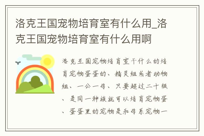 洛克王國寵物培育室有什么用_洛克王國寵物培育室有什么用啊