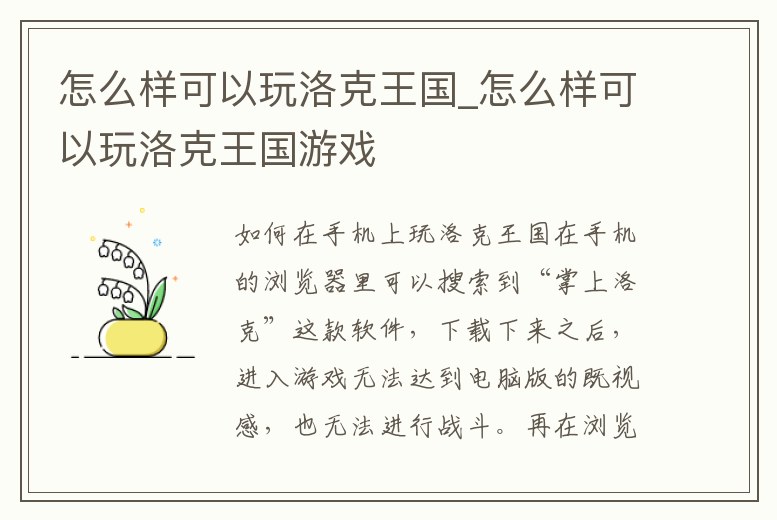 如何在手機上玩洛克王國在手機的瀏覽器里可以搜索到“掌上洛克”這款軟件,下載下來之后,進入游戲無法達到電腦版的既視感,也無法進行戰斗。再在瀏覽器搜索“4399洛克王國”,進入搜索下的4399洛克王國下載的官網頁面,在右上角可以看到“電。1、手機上怎么玩洛克王國通過QQ瀏覽器來玩01打開手機QQ瀏覽器。(手機上沒有安裝的請下載,目前只有QQ瀏覽器可以自動匹配洛克王國的flash插件。)02