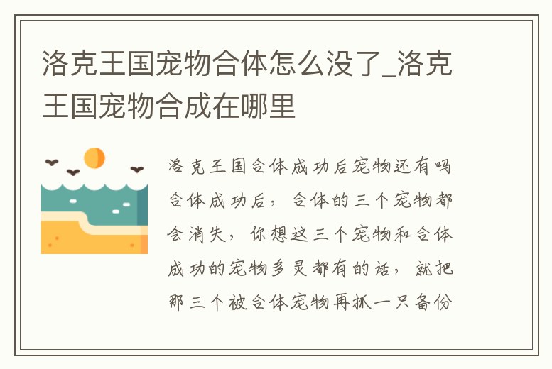 洛克王國合體成功后寵物還有嗎合體成功后,合體的三個寵物都會消失,你想這三個寵物和合體成功的寵物多靈都有的話,就把那三個被合體寵物再抓一只備份,這樣你什么寵物都有(雖然會浪費一點咕嚕球)。1、洛克王國為什么寵物會消失您好,