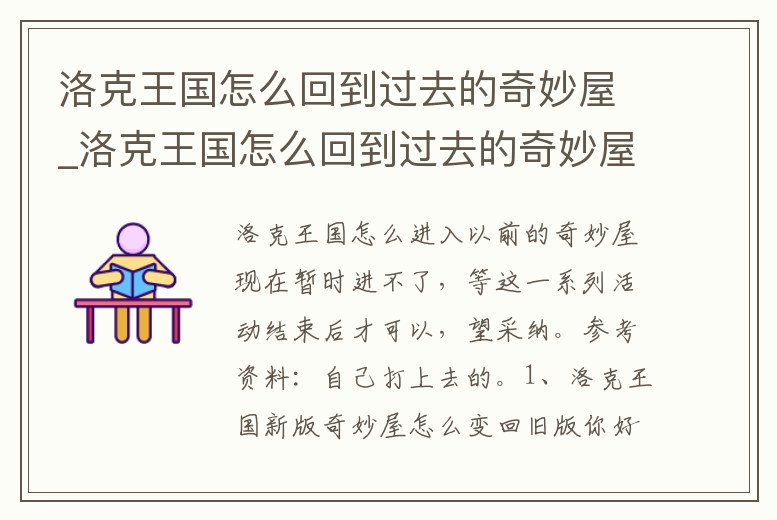 洛克王國怎么進入以前的奇妙屋現在暫時進不了,等這一系列活動結束后才可以,望采納。參考資料:自己打上去的。1、洛克王國新版奇妙屋怎么變回舊版你好,沒辦法回到舊版奇妙屋了。2、洛克王國我想成為偵探的凸透鏡沒了,奇妙屋改版了找不到怎么辦開寶箱的時候要解封印,那時屏幕要變黑,在下方中間慢慢移下鼠標,碰到凹透鏡后凹透鏡會亮起來,點一下就好了。3、洛克王國的奇妙屋在那網