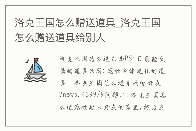 洛克王國怎么送東西PS:目前能交易的道具只有:寵物合體進(jìn)化的道具。洛克王國怎么送東西給好友?news.4399/9問題二:洛克王國怎么送寵物進(jìn)入好友的家里,然后點擊書柜左邊的箱子,然后把寵物蛋放進(jìn)去,不過要是自己孵出的寵物蛋才可以送人哦!問題。1、洛克王國怎么贈送寵物蛋洛克王國贈送寵物蛋如下點開地圖,單擊寵物園,去向箭頭指示的地方。看到左上方