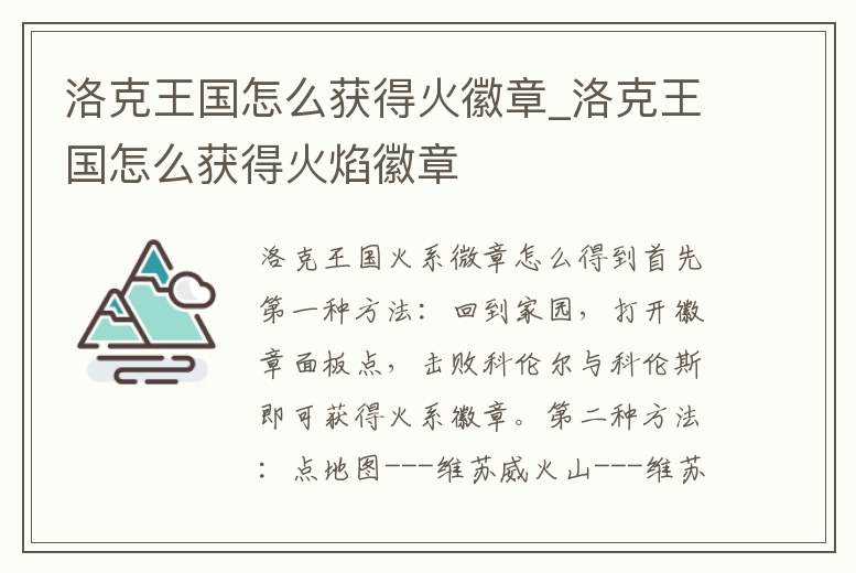 洛克王國(guó)火系微章怎么得到首先第一種方法:回到家園,打開(kāi)徽章面板點(diǎn),擊敗科倫爾與科倫斯即可獲得火系徽章。第二種方法:點(diǎn)地圖---維蘇威火山---維蘇威地殼---維蘇威地心維蘇威火山3點(diǎn)鐘方向有一塊大巖石荔枝地枯葉星羅棋布里邊曠世奇才要:點(diǎn)。1、洛克王國(guó)火系徽章怎么得洛克王國(guó),洛克王國(guó)火系徽章,洛克王國(guó)火系徽章在哪得,洛克王國(guó)火系徽章怎么得.回