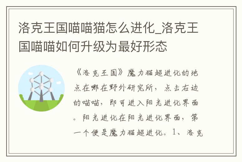 《洛克王國》魔力貓超進化的地點在哪在野外研究所,點擊右邊的喵喵,即可進入陽光進化界面。陽光進化在陽光進化界面,第一個便是魔力貓超進化。1、洛克王國100級喵嗚什么情況:1.當喵喵等級達到16級會進化成為喵嗚。2.當喵嗚等級達到32級會進化成為魔力貓。3.當魔力貓等級要達到100級時,收集陽光收集瓶,可以在…步驟如下。洛克王國喵喵怎么進化成武斗酷貓?武斗酷貓由魔力貓多元進化而來,魔。2、