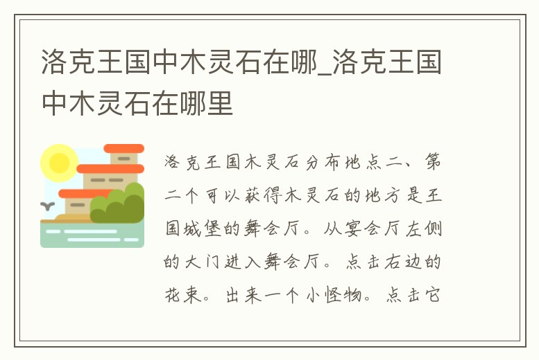 洛克王國木靈石分布地點二、第二個可以獲得木靈石的地方是王國城堡的舞會廳。從宴會廳左側的大門進入舞會廳。點擊右邊的花束。出來一個小怪物。點擊它,它吐出一個泡泡后消失了。點擊泡泡,得到了第二塊木靈石。三、第三顆木。1、洛克王國木靈石怎么獲得洛克王國木靈石獲得方法:洛克王國有兩處地方可以找到木靈石。在植物園有棵大竹筍,狂點它,然后出來一個好像玉米的東西,再點一
