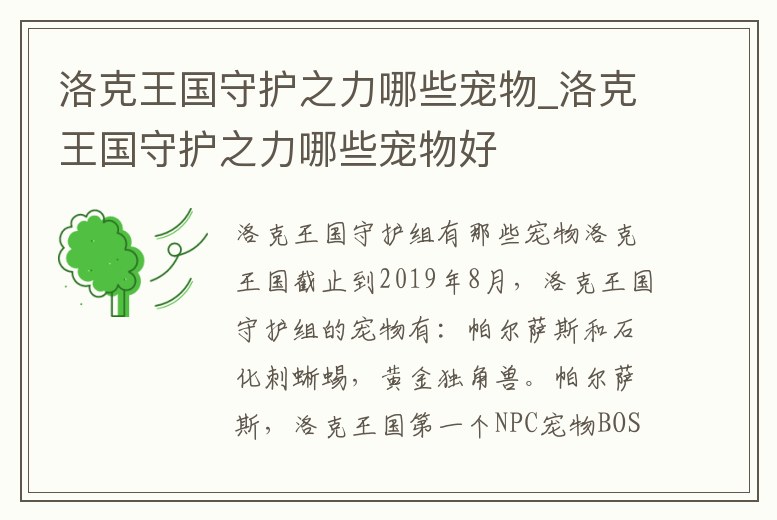 洛克王國截止到2019年8月,洛克王國守護組的寵物有:帕爾薩斯和石化刺蜥蜴,黃金獨角獸。帕爾薩斯,洛克王國第一個NPC寵物BOSS,編號366,屬性:惡魔系,守護著伯爵。而在洛克精靈戰記中屬于火系,同時為了避免與圣獸毀滅之。