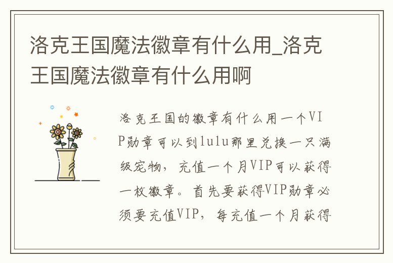 一個VIP勛章可以到lulu那里兌換一只滿級寵物,充值一個月VIP可以獲得一枚徽章。首先要獲得VIP勛章必須要充值VIP,每充值一個月獲得一枚徽章。本月充值獲得的徽章可以到下個月再兌換。背景:《洛克王國》是由騰訊游戲魔方工作室。