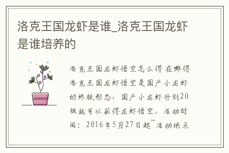 洛克王國龍蝦悟空是國產小龍蝦的終極形態,國產小龍蝦升到20級就可以獲得龍蝦悟空。活動時間:2016年5月27日起~活動地點:同心山頂 活動獎勵:斗戰勝佛稱號、國產小龍蝦 。