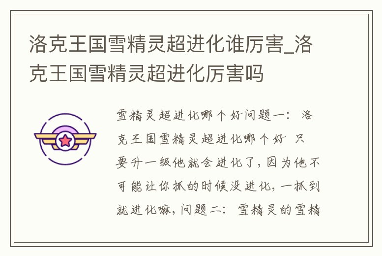 問題一:洛克王國雪精靈超進化哪個好 只要升一級他就會進化了,因為他不可能讓你抓的時候沒進化,一抓到就進化嘛,問題二:雪精靈的雪精靈超進化 作為雪精靈,有兩種超進化形態:冰翼晶靈 和傲雪冰靈,都是未知組別,不。