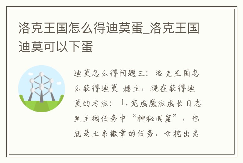 問題三:洛克王國(guó)怎么獲得迪莫 樓主,現(xiàn)在獲得迪莫的方法: 1.完成魔法成長(zhǎng)日志里主線任務(wù)中“神秘洞窟”,也就是土系徽章的任務(wù),會(huì)挖出光明之蛋,孵出迪莫。不過要從“你好,魔法學(xué)院”開始做起,完成草、水、火幾個(gè)徽章。