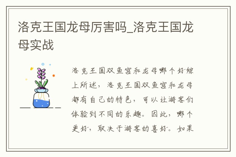 綜上所述,洛克王國雙魚宮和龍母都有自己的特色,可以讓游客們體驗到不同的樂趣。因此,哪個更好,取決于游客的喜好。如果游客喜歡海洋主題,那么洛克王國雙魚宮可能更適合他們;如果游客喜歡古代中國主題,那么龍母可能更適合他。