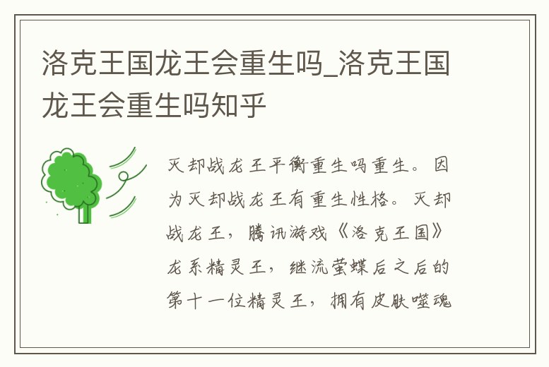 重生。因為滅卻戰龍王有重生性格。滅卻戰龍王,騰訊游戲《洛克王國》龍系精靈王,繼流螢蝶后之后的第十一位精靈王,擁有皮膚噬魂戰龍王。