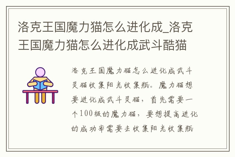 收集陽光收集瓶。魔力貓想要進化成武斗靈貓,首先需要一個100級的魔力貓,要想提高進化的成功率需要去收集陽光收集瓶。《洛克王國》是由騰訊游戲魔方工作室群發行并運營的網頁游戲,于2010年7月15日正式公測。在王國里,玩家。