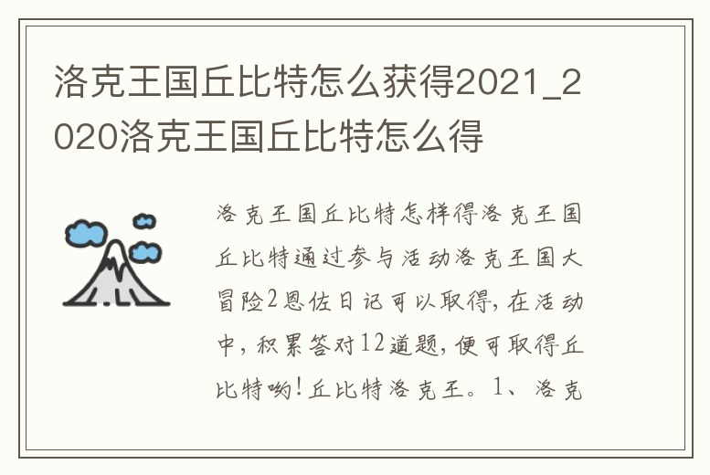 獲得方式:現在參加活動【洛克王國大冒險2恩佐日記】,參與回答問題,只要在活動期間回答正確12道題目,你就能獲得丘比特 請采納 。