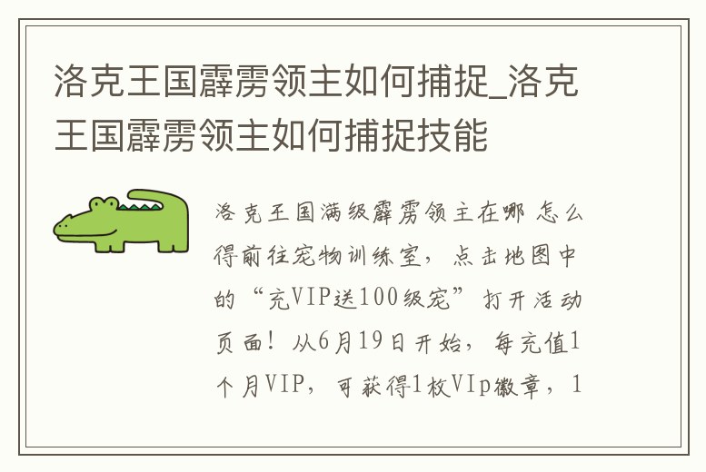 前往寵物訓(xùn)練室,點(diǎn)擊地圖中的“充VIP送100級(jí)寵”打開(kāi)活動(dòng)頁(yè)面!從6月19日開(kāi)始,每充值1個(gè)月VIP,可獲得1枚VIp徽章,1枚VIP徽章可以用來(lái)兌換1只100級(jí)的寵物哦!每個(gè)月能兌換的VIP寵物不同,7月是霹靂領(lǐng)主哦。