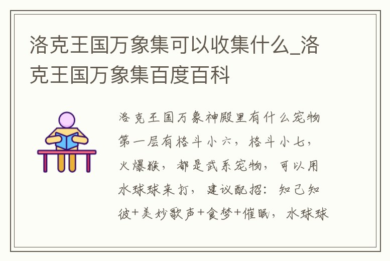 回答:洛克王國競技場大廳最后一殿——萬神殿,各層寵物: 一層(武):格斗小六 格斗小七 火爆猴 BOSS:格斗小六 格斗小七 火爆猴 二層(毒):扁嘴蝠 古路尼 古啦多(主戰羅隱) BOSS:扁嘴蝠 古路尼 古啦多 三層(混合):。