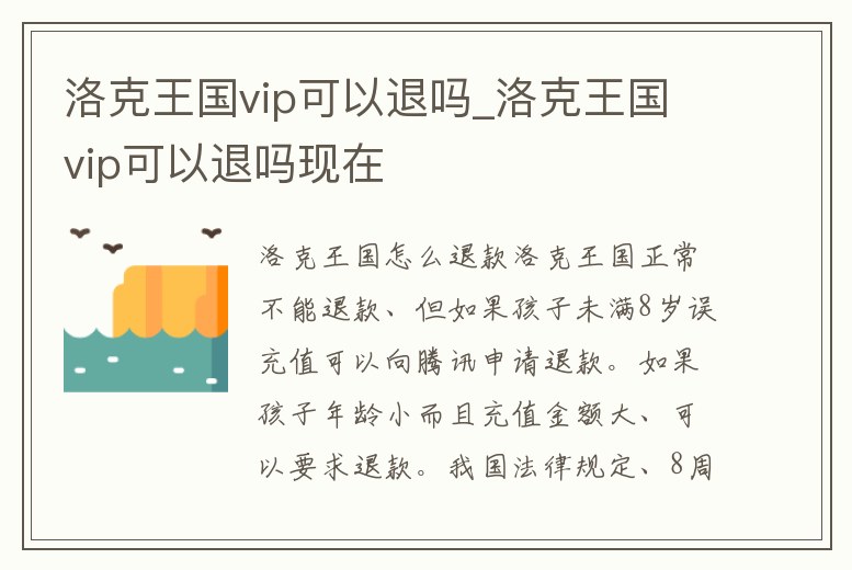 洛克王國正常不能退款、但如果孩子未滿8歲誤充值可以向騰訊申請退款。如果孩子年齡小而且充值金額大、可以要求退款。我國法律規定、8周歲以上的未成年人為限制民事行為能力人、實施的民事法律行為效力待定,應由其法定代理人代理。
