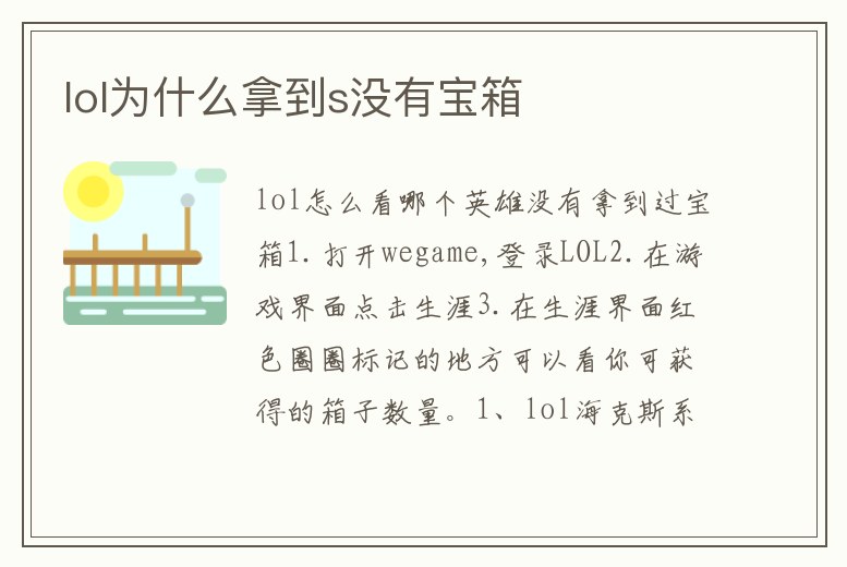 lol怎么看哪個英雄沒有拿到過寶箱1.打開wegame,登錄LOL2.在游戲界面點擊生涯3.在生涯界面紅色圈圈標(biāo)記的地方可以看你可獲得的箱子數(shù)量。1、lol海克斯系統(tǒng)為什么打了s不給寶箱需要你本人操作評分S以上,S-不算,如果本人操作S以上沒給寶箱就是卡了,重上游戲。2、lol海克斯科技箱子傳送門怎么獲得游戲獲取使用某英雄在