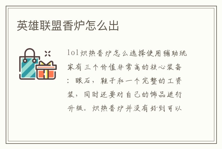 lol香爐是熾熱香爐,這是一件輔助裝備,能夠提供法術強度,法力回復,冷卻縮減,移動速度,增加治療與護盾強度。lol香爐裝備介紹 熾熱香爐,游戲英雄聯盟中的裝備;熾熱香爐是一件輔助裝備,能夠提供法術強度,法力回復,冷卻縮減。