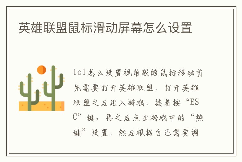 首先需要打開英雄聯盟。打開英雄聯盟之后進入游戲。接著按“ESC”鍵,再之后點擊游戲中的“熱鍵”設置。然后根據自己需要調整鼠標速度。然后根據自己需要調整鏡頭速度,這樣就可以設置視角跟隨鼠標移動。