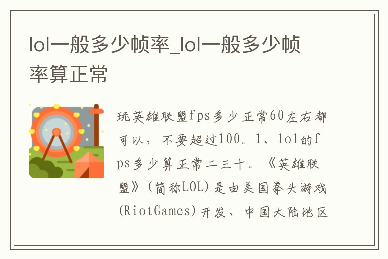 玩英雄聯(lián)盟fps多少正常60左右都可以,不要超過100。1、lol的fps多少算正常二三十?!队⑿勐?lián)盟》(簡稱LOL)是由美國拳頭游戲(RiotGames)開發(fā)、中國大陸地區(qū)騰訊游戲代理運營的英雄對戰(zhàn)DOTA類競技網(wǎng)游。游戲里擁有數(shù)百個個性英雄,并擁有排位系統(tǒng)、天賦系統(tǒng)、符文系統(tǒng)等特色養(yǎng)成系統(tǒng)。《英雄聯(lián)盟》還致力于推。2、英雄聯(lián)盟是多少幀畫面英雄