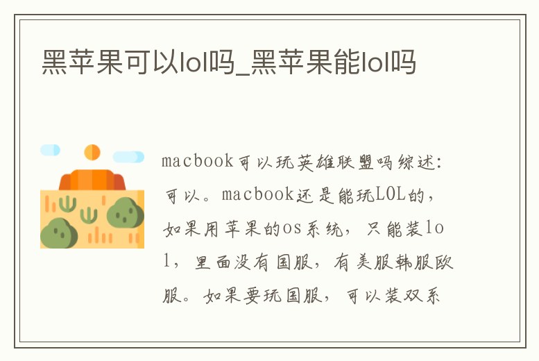 綜述:可以。macbook還是能玩LOL的,如果用蘋果的os系統,只能裝lol,里面沒有國服,有美服韓服歐服。如果要玩國服,可以裝雙系統或者虛擬機,如果用的是pd虛擬機,vm也可以。玩國服就只能雙系統或者虛擬機裝win了。英雄聯。