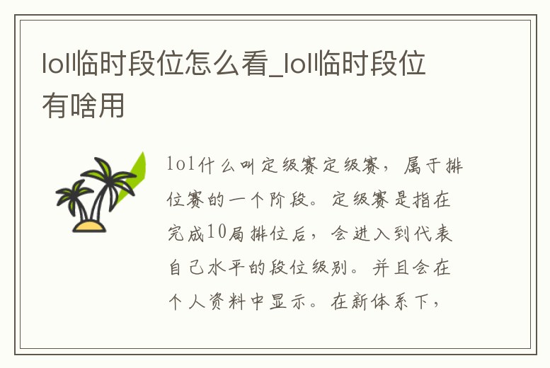 lol什么叫定級賽定級賽,屬于排位賽的一個階段。定級賽是指在完成10局排位后,會進入到代表自己水平的段位級別。并且會在個人資料中顯示。在新體系下,玩家將能看到自己和他人的段位和級別。在定級賽進行中,玩家將能夠看到一個臨時段位,該。1、lol怎么看自己的段位進入英雄聯盟游戲主頁面,會看到一個召喚師資料信息