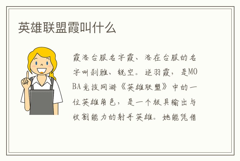 霞、洛在臺服的名字叫剎雅、銳空。逆羽霞,是MOBA競技網游《英雄聯盟》中的一位英雄角色,是一個極具輸出與收割能力的射手英雄。她能憑借著具有穿刺效果的羽毛,同時對敵方前排與后排造成大量傷害。霞最擅長的就是使用羽毛。