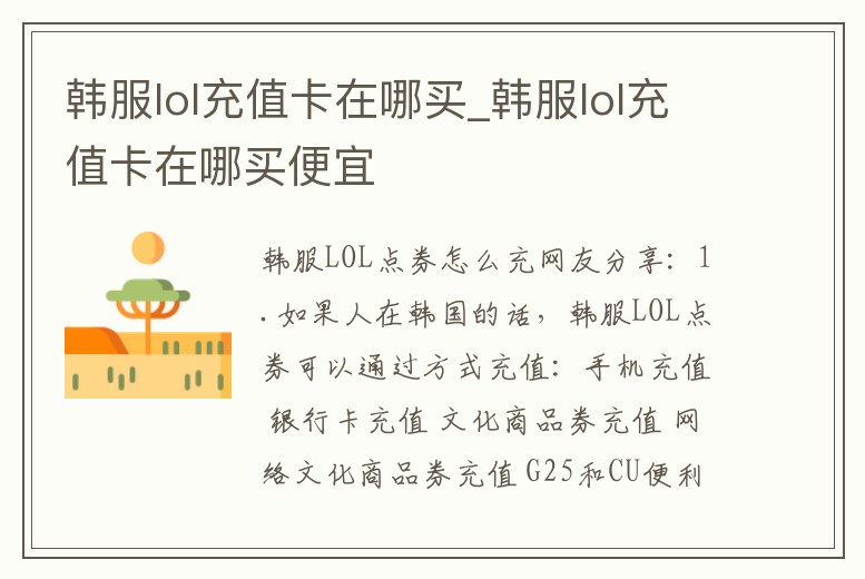 網(wǎng)友分享:1.如果人在韓國(guó)的話,韓服LOL點(diǎn)券可以通過(guò)方式充值:手機(jī)充值 銀行卡充值 文化商品券充值 網(wǎng)絡(luò)文化商品券充值 G25和CU便利店買充值卡充值 信用卡充值 2.如果是中國(guó)玩家玩韓服也不懂韓語(yǔ)的話就只能通過(guò)某寶的商家代充或者找。