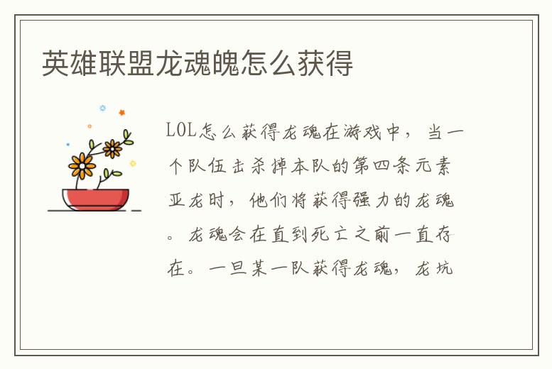 龍魂,游戲《英雄聯盟》中的設定,擊殺4條元素亞龍可以獲得。它將提供類似史詩野怪增益般強大的獎勵。龍魂并不能提供像男爵或遠古巨龍那樣瞬時的增益。它卻是一個永久的、為玩家已擁有的元素亞龍增益提供額外效果的獎勵 。